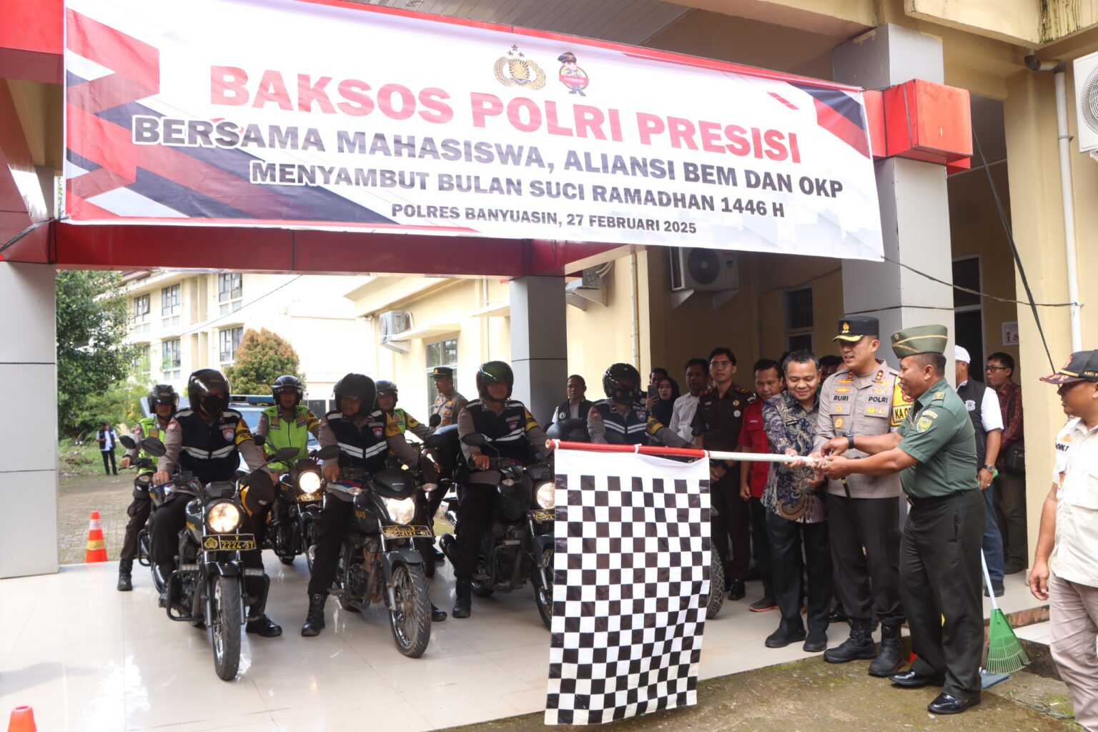 BANYUASIN,OS – Menyambut bulan suci Ramadan 1446 Hijriah, Kepolisian Resor (Polres) Banyuasin menunjukkan kepedulian sosial dengan membagikan paket sembako kepada mahasiswa, Badan Eksekutif Mahasiswa (BEM), dan Organisasi Kepemudaan (OKP). Kegiatan bertajuk bakti sosial (baksos) ini digelar di Aula Sanika Satyawada, Kamis (27/2/25), dipimpin langsung oleh Kapolres Banyuasin AKBP Ruri Prastowo SH SIK MIK