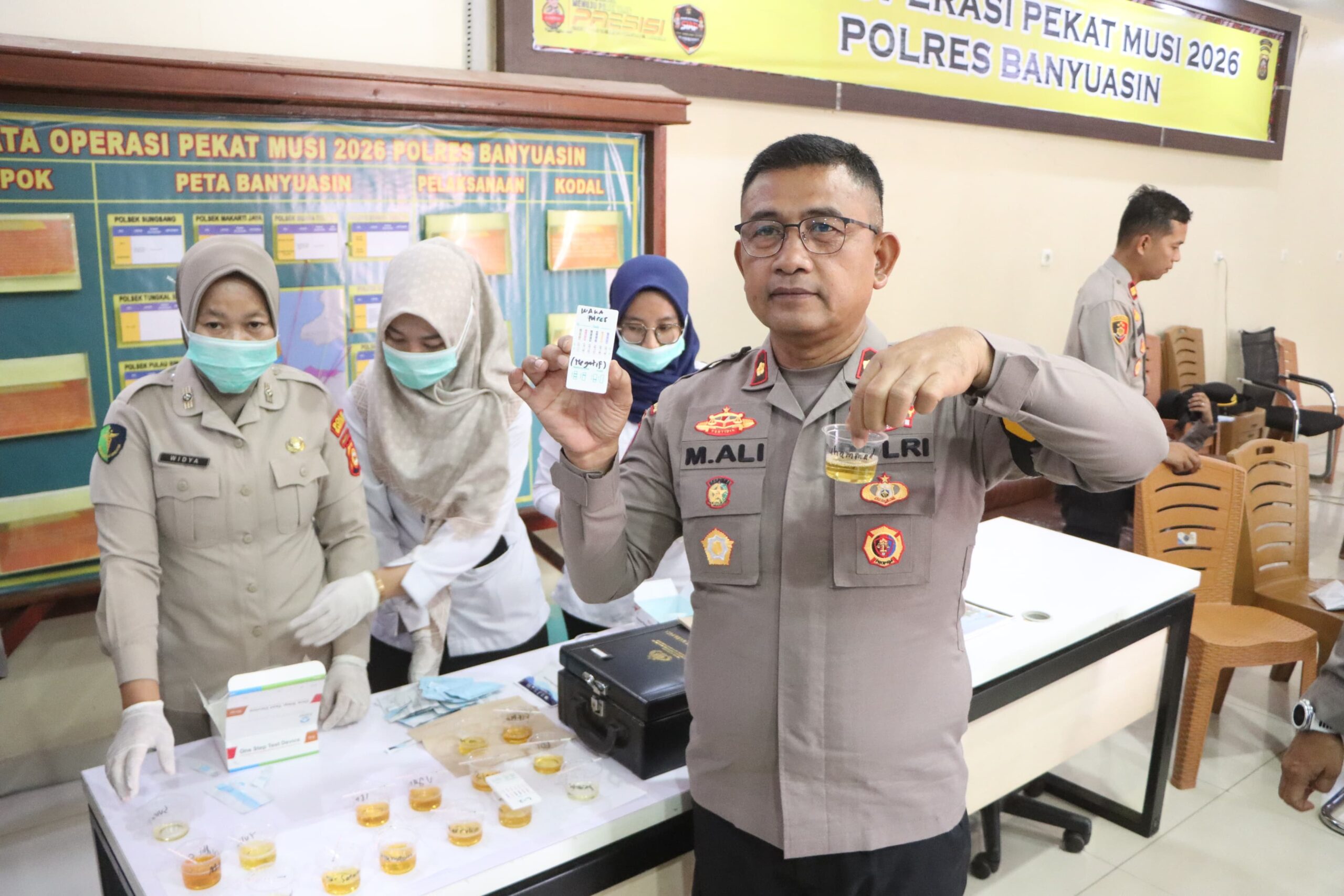 Kasi Propam Polres Banyuasin menyampaikan bahwa pemeriksaan berlangsung tertib dan lancar Dari hasil uji laboratorium, seluruh sampel urine yang diambil dari para pimpinan dinyatakan negatif dari penyalahgunaan narkotika.