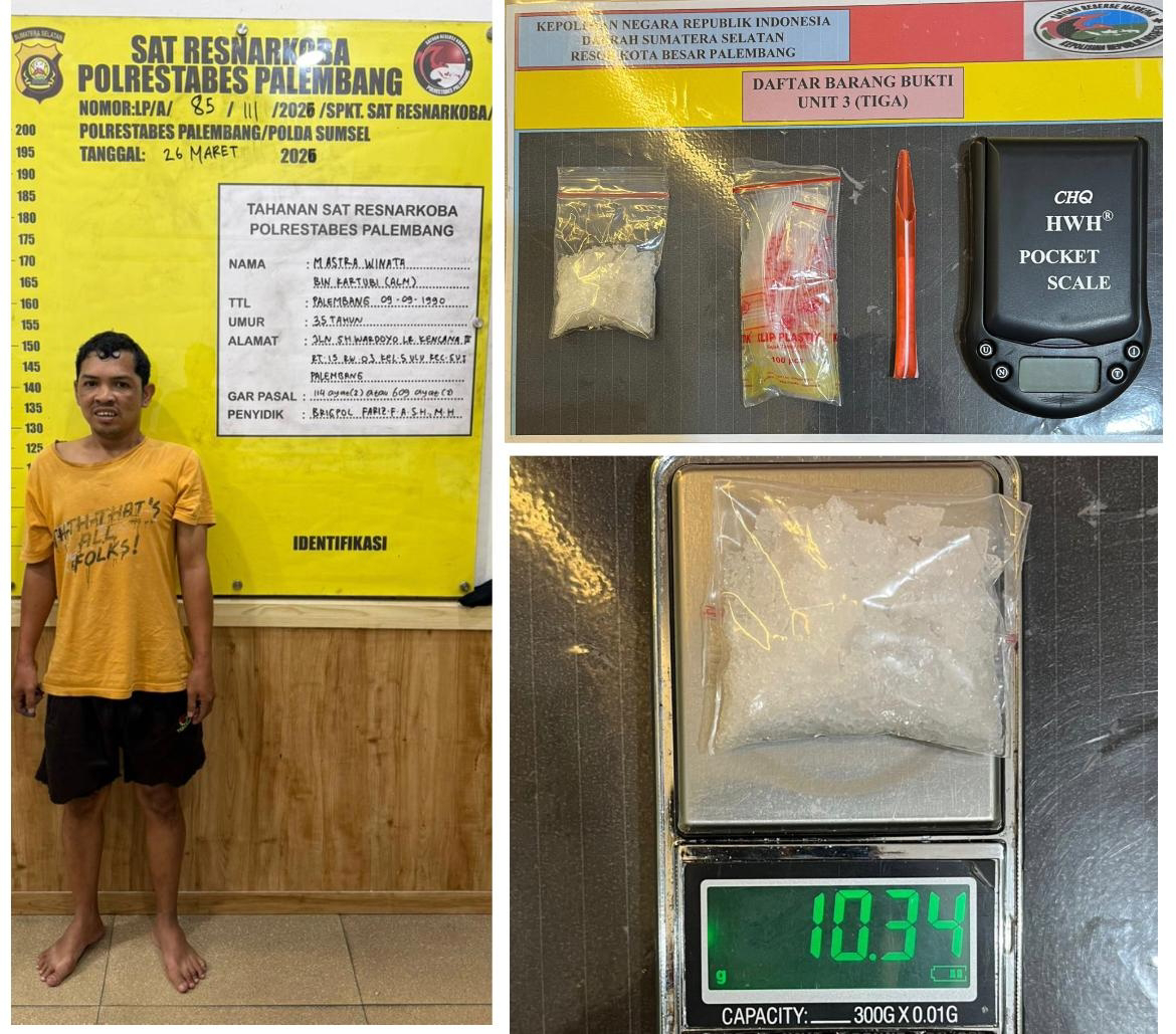 Dalam penangkapan tersebut, petugas menemukan satu paket sabu seberat bruto 10,34 gram yang masih berada dalam genggaman tangan kanan tersangka. Kondisi tangkap tangan ini menjadi bukti kuat kepemilikan dan penguasaan narkotika oleh tersangka.